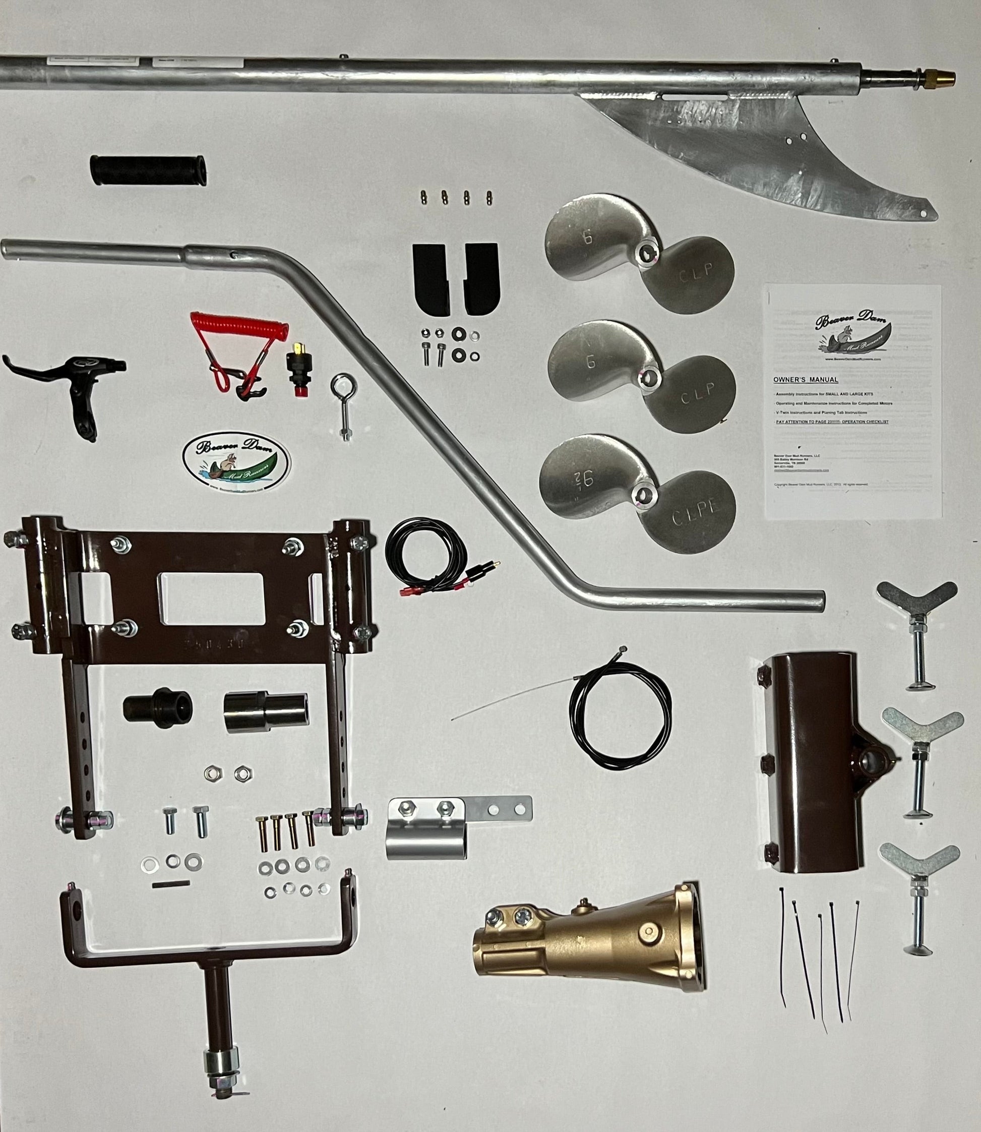 Kits include heavy duty metal alloy end bushing, upgraded internal, heavy duty bushings, angled handle, Extra Wide and Deep Transom Mount, squeeze type throttle, high quality kill switch with wiring harness, Planing Tabs and THREE PROPS (over a $300 value!!!)